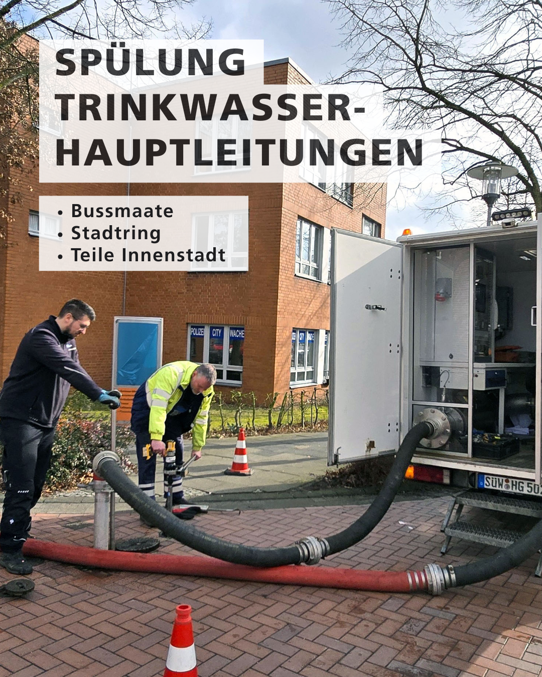 Dabei kommt das sogenannte Wasser-Saug-Spülverfahren zum Einsatz. Es entfernt natürliche Ablagerungen in den Hauptleitungen – und das ganz ohne Unterbrechung der Wasserversorgung. Lediglich ein kurzfristiger Druckabfall kann in Einzelfällen auftreten. 🚿